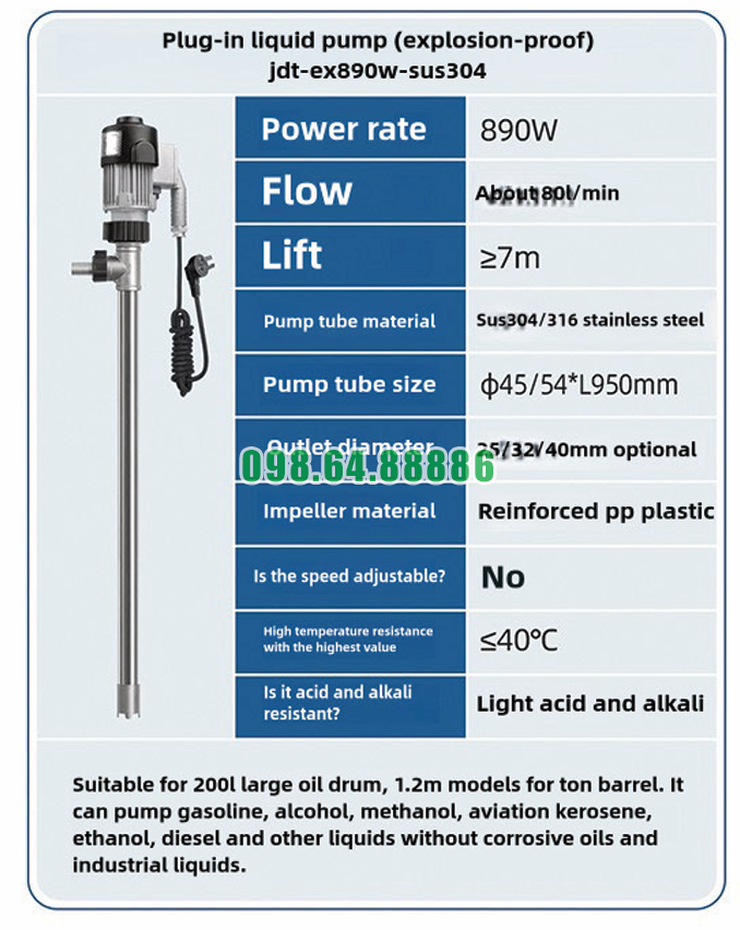 Máy bơm chất lỏng chống cháy nổ dùng cho thùng phuy JDT-EX890W-SUS304