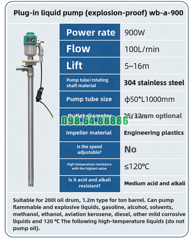 Máy bơm chất lỏng inox 304 chống cháy nổ WB-A-900 dùng để chiết rót cồn công nghiệp là thiết bị chuyên dụng giúp đảm bảo an toàn, hiệu suất và độ bền. Với thiết kế phù hợp và khả năng vận hành ổn định, WB-A-900 đáp ứng tốt yêu cầu sang chiết trong môi trường dung môi công nghiệp.