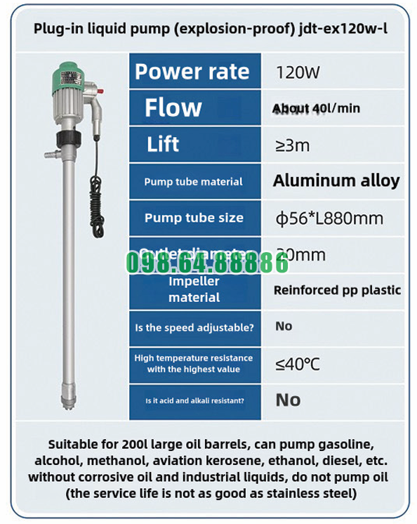 Thông số Máy bơm chất lỏng cắm trực tiếp chống cháy nổ JDT-EX120W-L