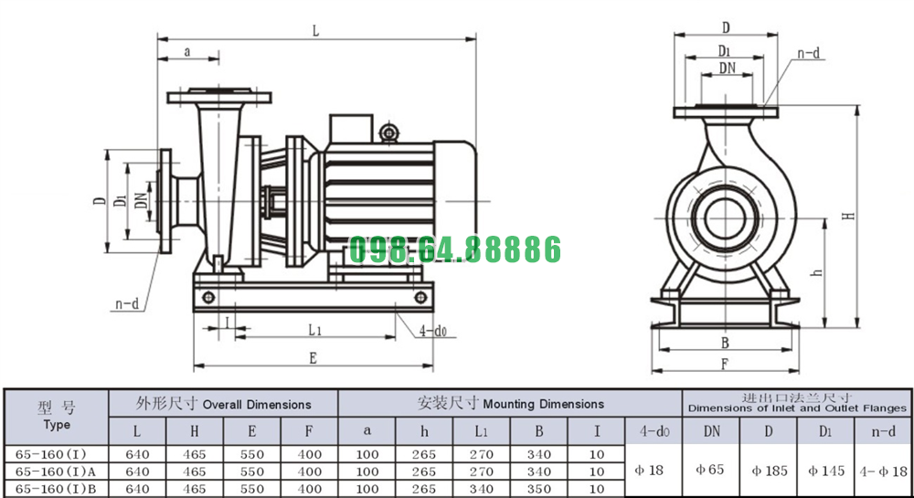 Bản vẽ cấu tạo và kích thước bơm nước trục ngang mã SLW65-ISW65-160-I động cơ 7.5 kw