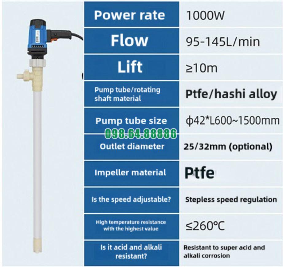 Quy trình vận hành Bơm điện nhúng thùng phuy hóa chất chống ăn mòn model JDT-1000W-PTFE