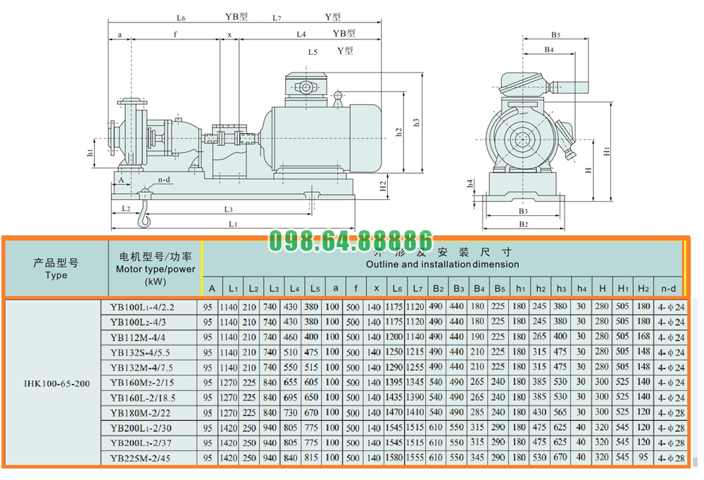 Kích thước của đầu máy bơm nước li tâm trục ngang cánh hở IHK100-65-200 kích thước Dn100