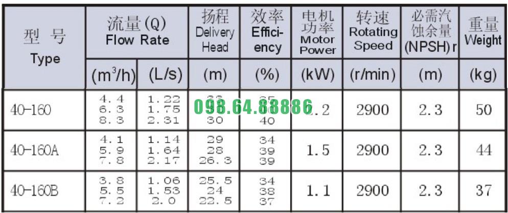 Bảng thông số kỹ thuật bơm nước trục ngang model SLW-ISW40-160 công suất 2.2 kw đẩy cao 33m