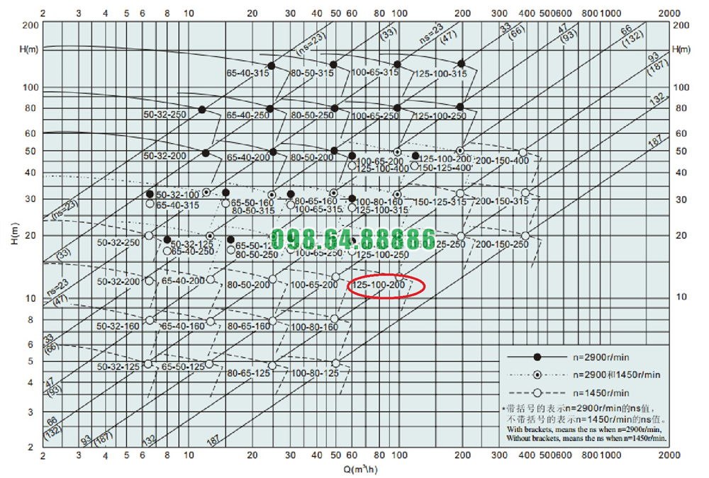 Bảng lưu lượng của bơm li tâm cánh hở đường thoát 100 mm model IHK125-100-200