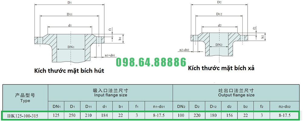 Kích thước mặt bích của bơm li tâm cánh hở đường thoát 125mm model IHK150-125-315
