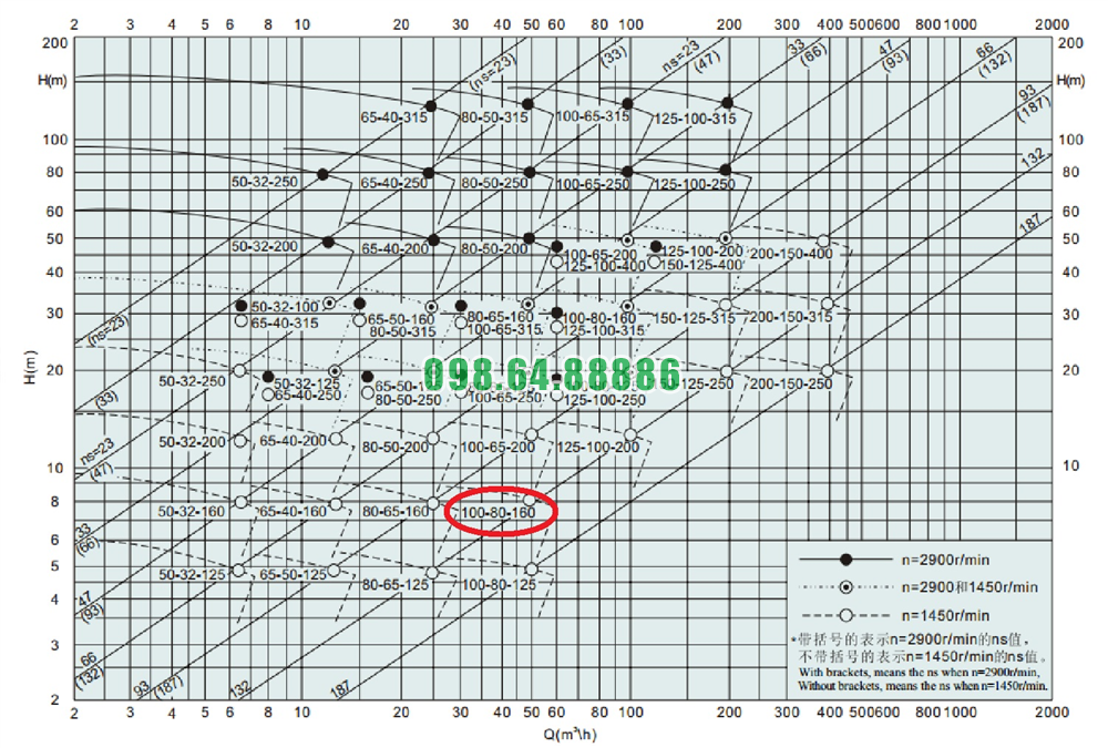 Bảng lưu lượng của bơm li tâm cánh hở đường thoát 80 mm model IHK100-80-160