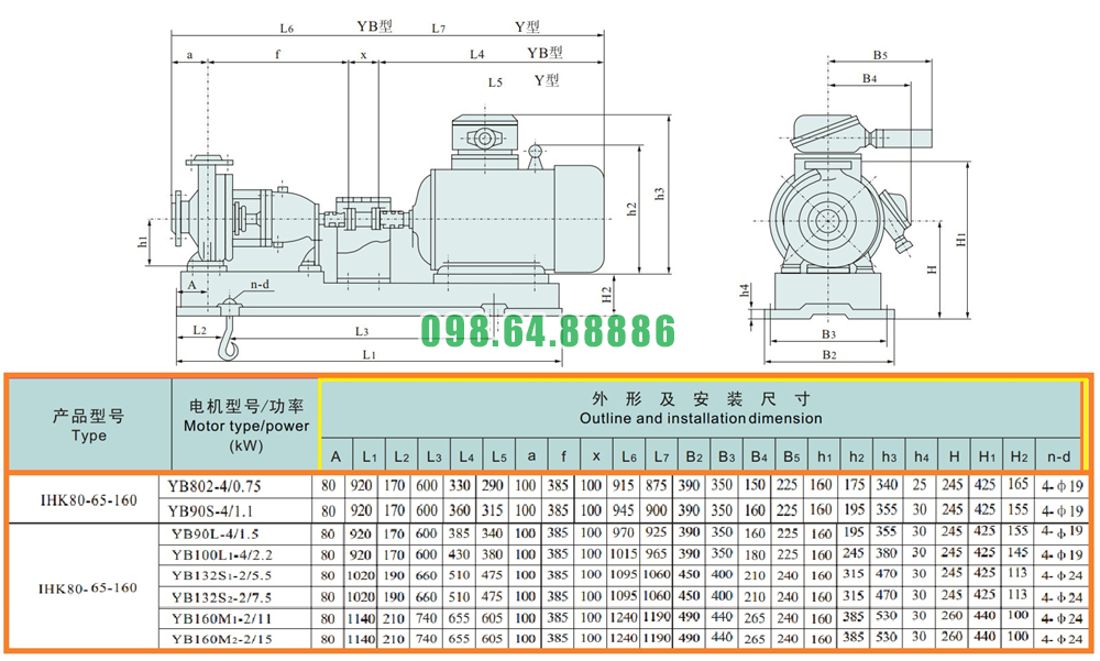 Kích thước lắp đặt của bơm li tâm cánh hở đường thoát 80 mm model IHK100-80-160
