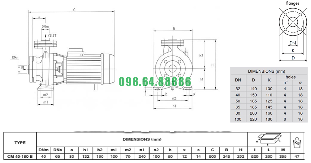 Kích thước bơm li tâm trục ngang đường thoát 40 mm model CM40-160B